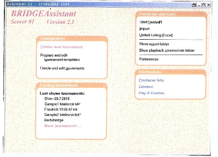 Auf dieser Seite wird Ihnen ein perfektes Programm für die Abwicklung von Bridgeturnieren angeboten. Es ist u.a in der Lage, Ihre Turnierergebnisse mühelos ins Internet zu transferieren. Siehe Beispiel Mallorca, unten. Das Programm ist kostenfrei, Sie müssen nichts zahlen. Siehe Hinweise auf der Startseite.
